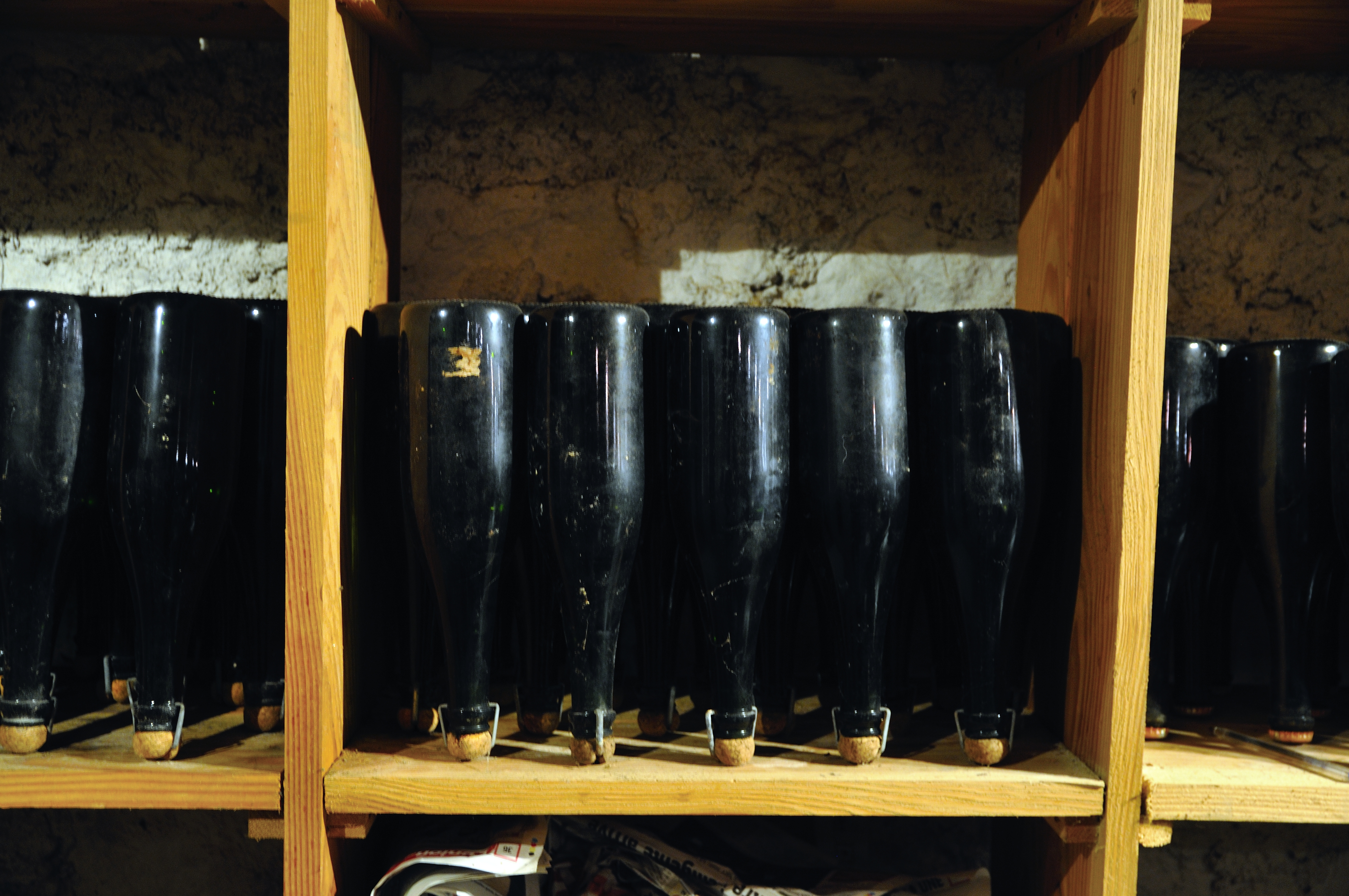Vieux millésimes(79, 82...) sur pointe. Les vieux bouchons ont été remplacés par des neufs, qui sont fixés avec des agrafes.