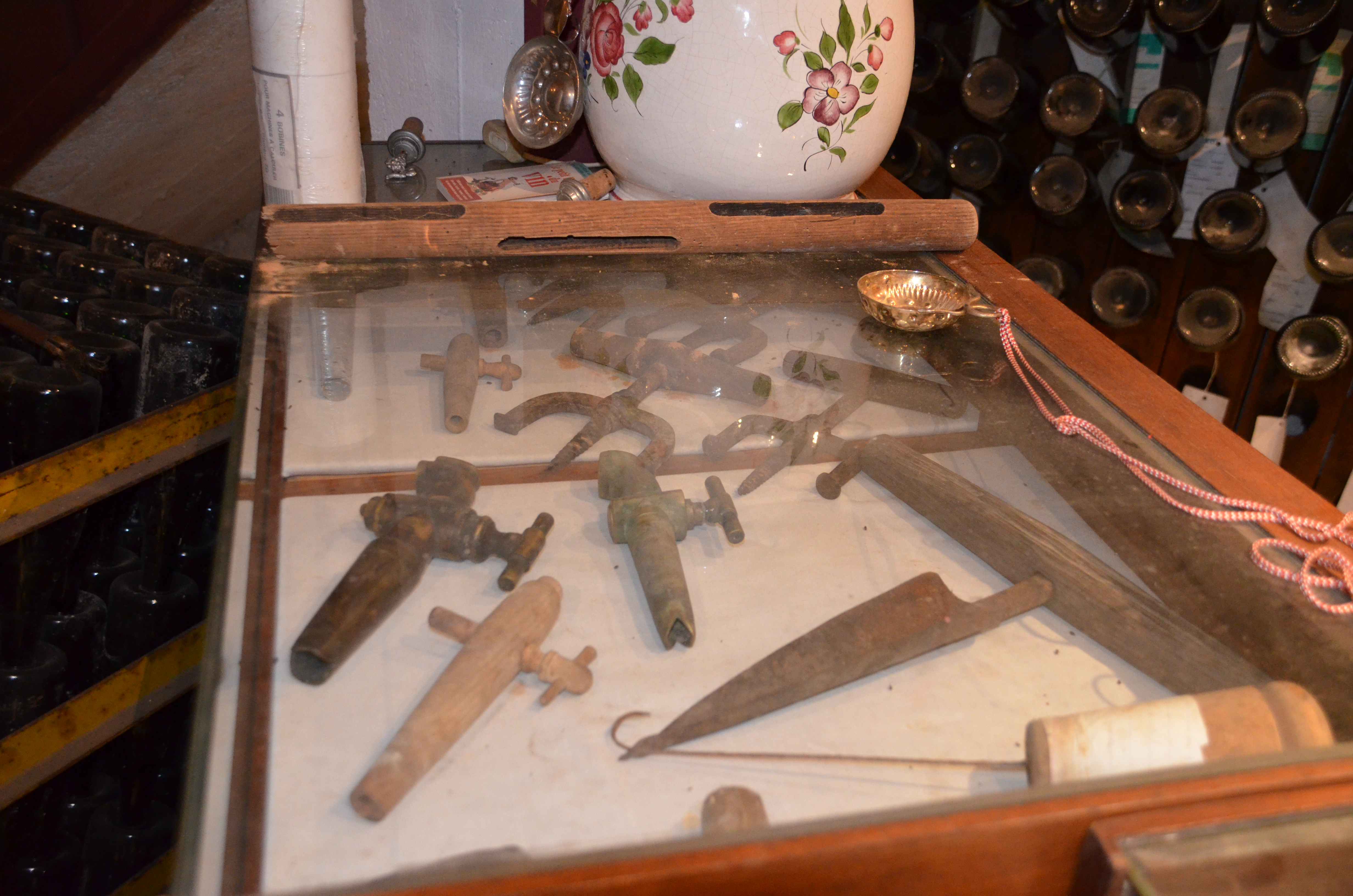 Dans la cave de Maurice: les vieux outils du vigneron, dont le bâton pour bâtonner les blancs.