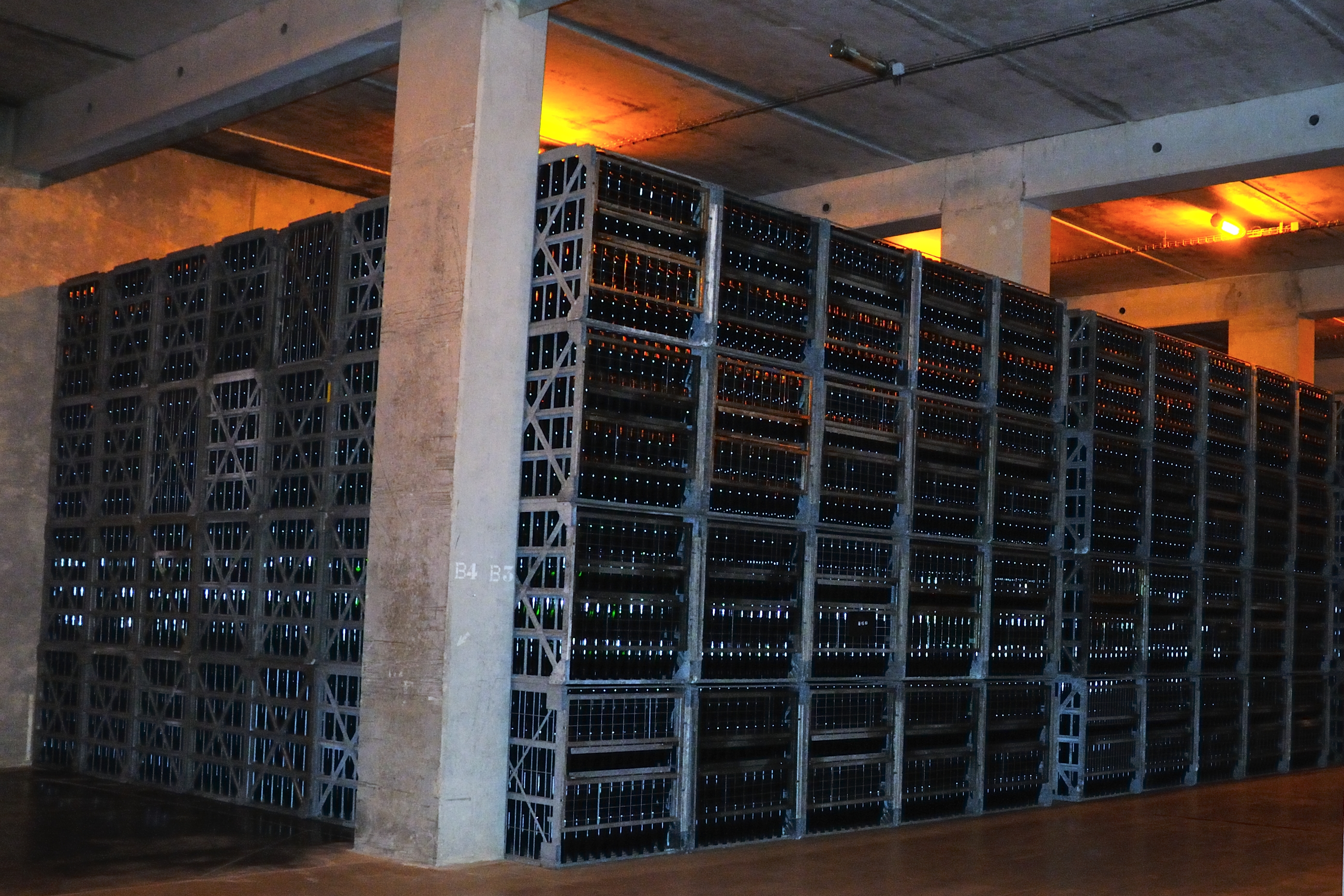 Les caves les plus récentes: 9m sous plafond, avec quatre étages. La craie se creuse très facilement. Environ 140.000 bouteilles sur pointe dans cette allée, en train de vieillir tranquillement. En tout, 35.000.000 de bouteilles en stock chez Besserat de Bellefon.
