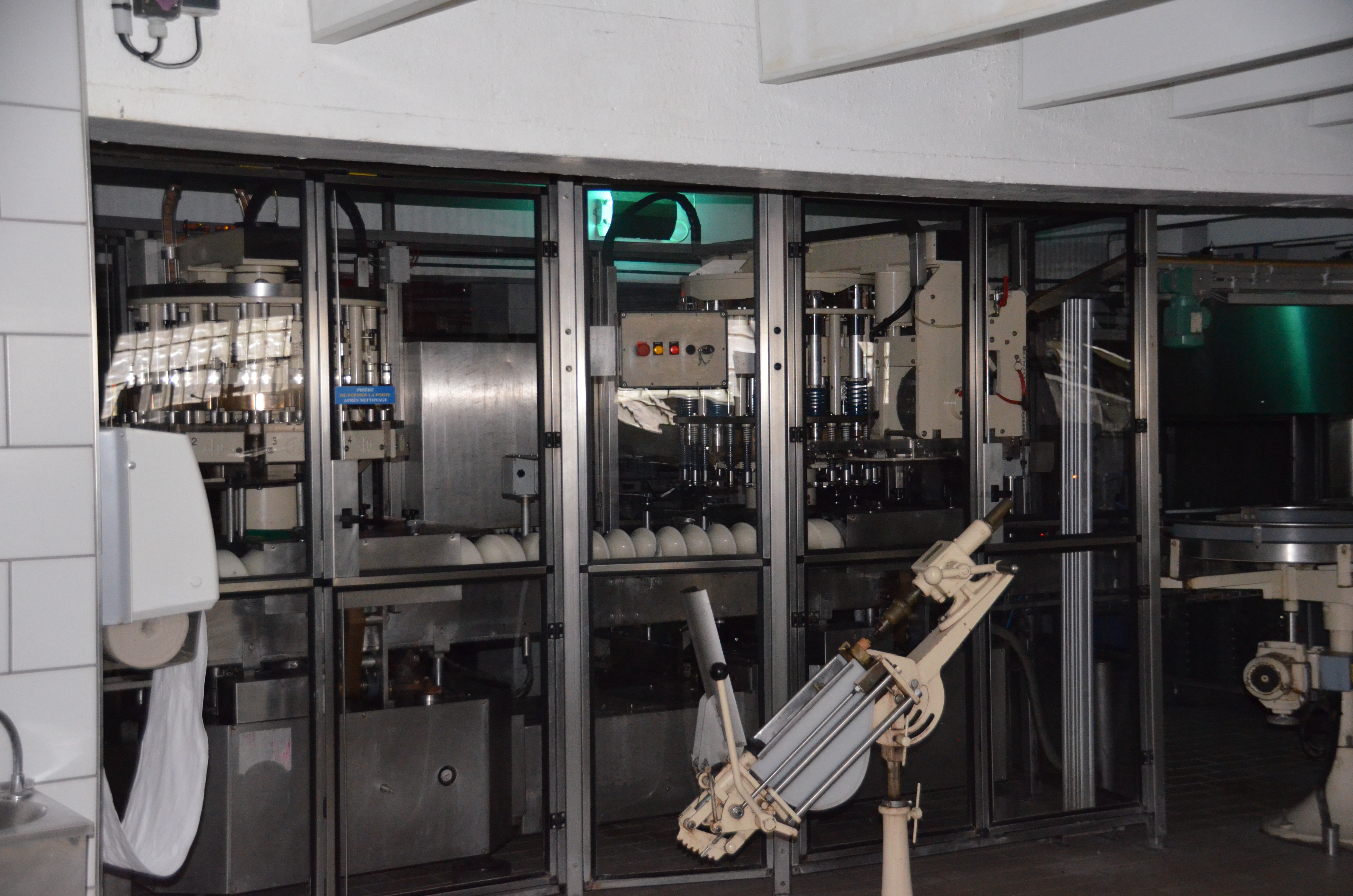 Le dégorgement, avec le bossin pour les bouchons réclacitrants! Mais ici la main de l'opérateur est protégée : ce n'est pas lui qui tient la bouteille.
