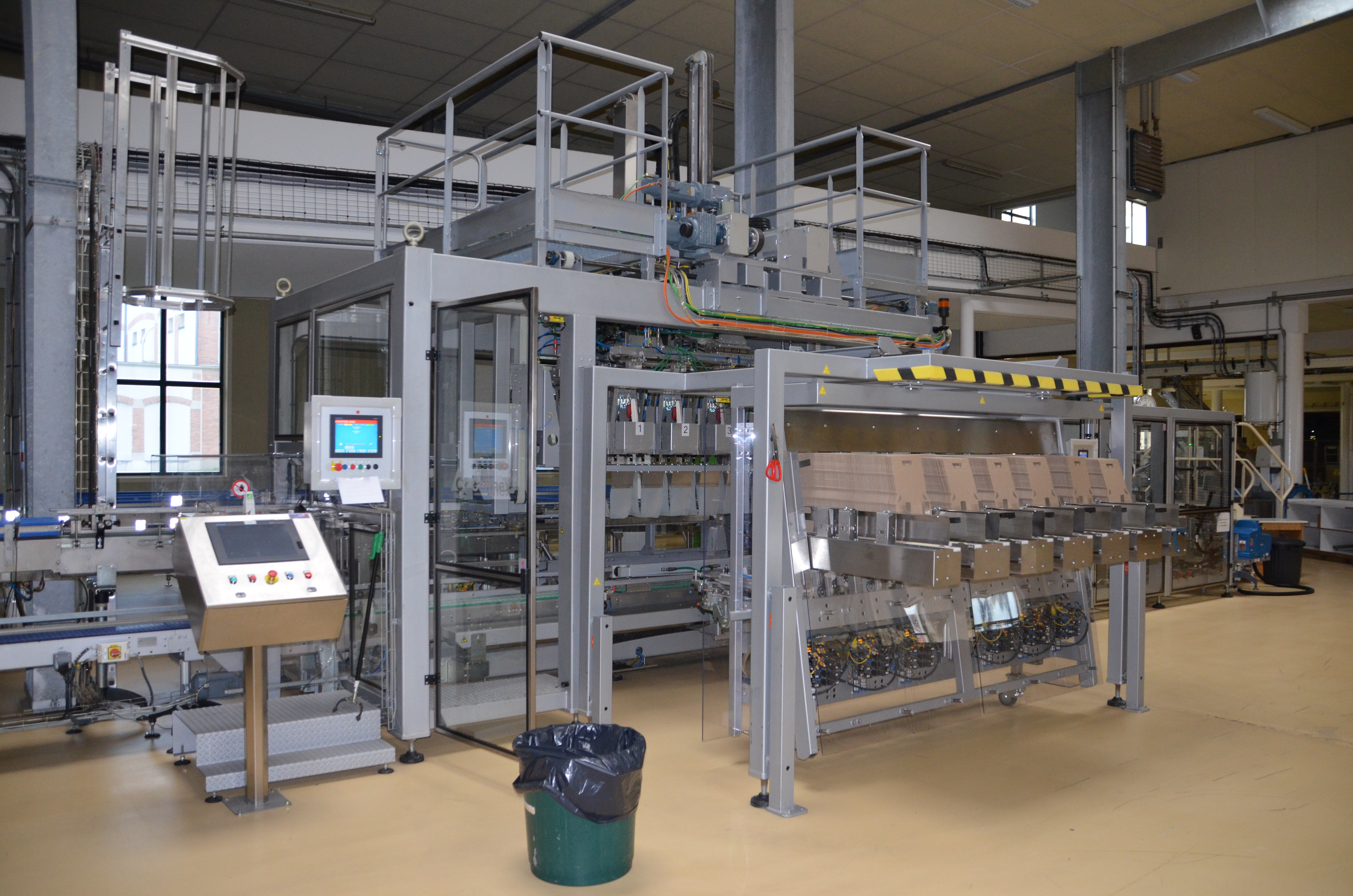 Les robots d'emballage : les bouteilles sont conditionnées tête-bêche dans des cartons de 6 ou 12 cols, qui sont palettisés et donc prêts pour l'expédition.