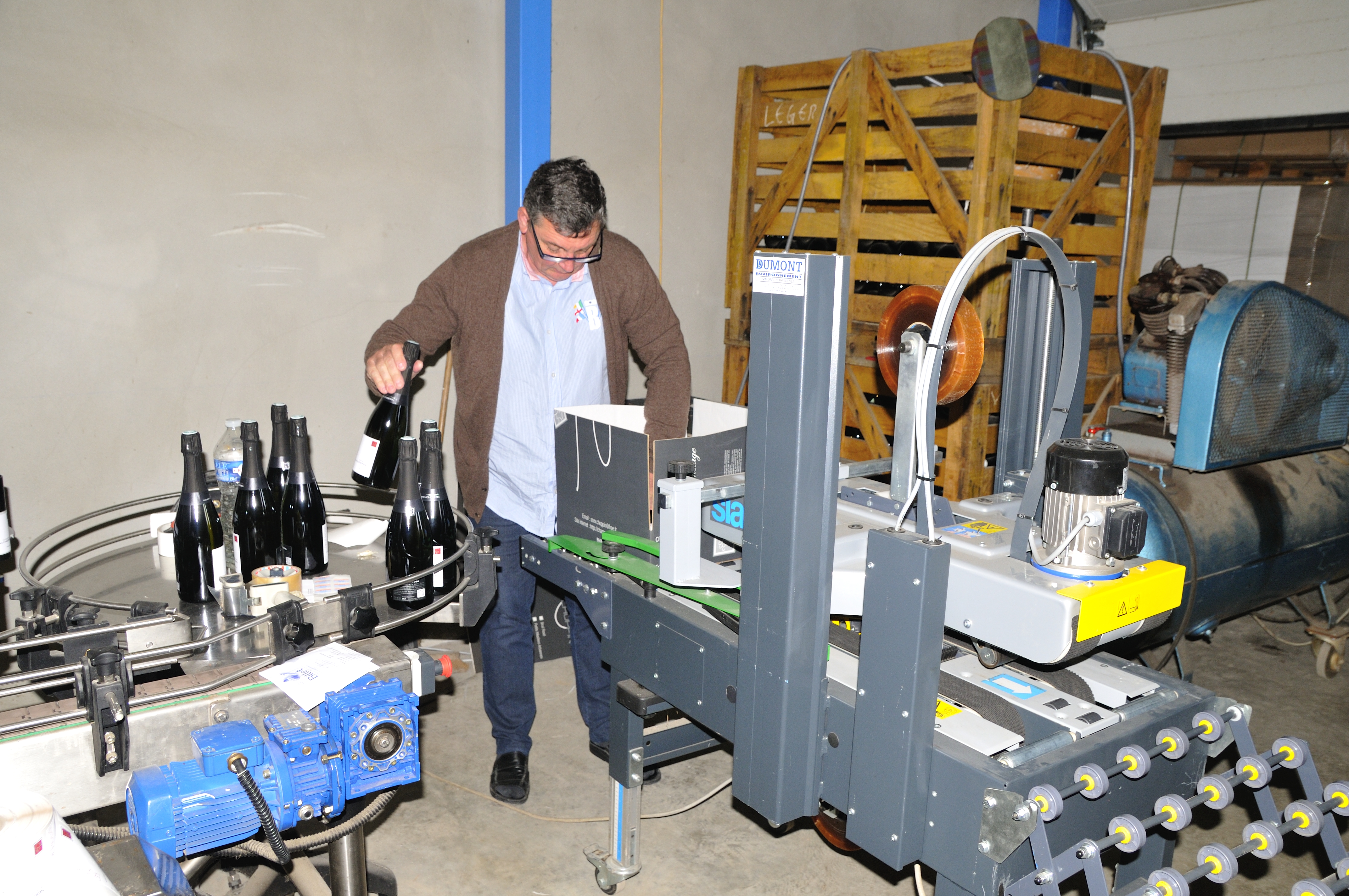 Poste d'emballage. Les bouteilles doivent être rangées à la main dans le carton. Il faut étaler le rythme de 800 bouteilles à l'heure.